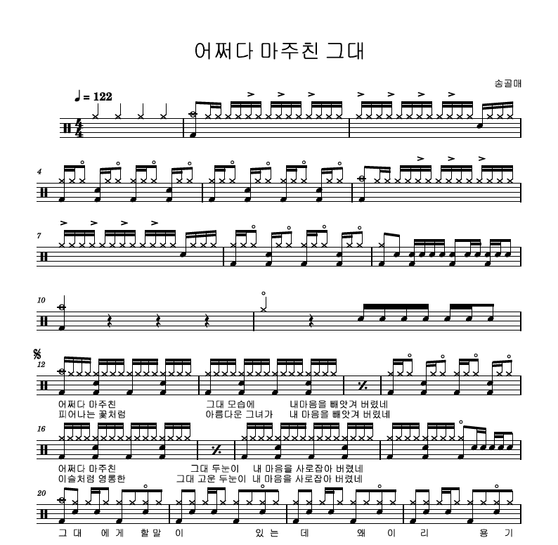 송골매 어쩌다 마주친 그대 드럼 악보 무료다운로드|레트로 록 감성 연주곡